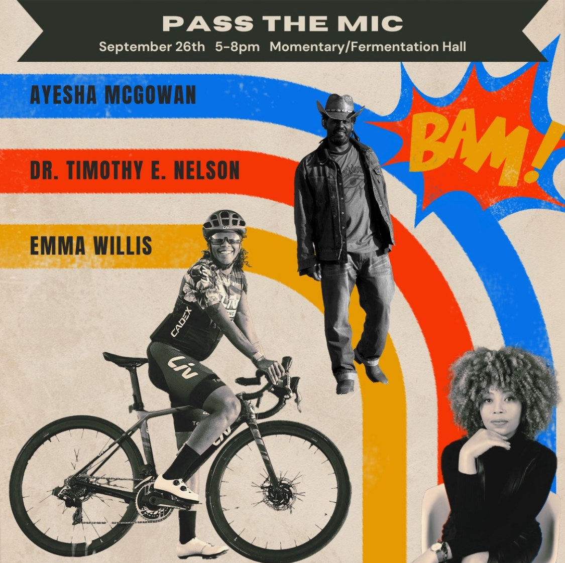 @bike.poc annual "Pass the Mic” panel discussion on equity, history, movement, and how we can co-create and imagine our futures together. Our panelists, historian, author Dr. Timothy E. Nelson, pro cyclist Ayesha McGowan, entrepreneur, investor, and consultant Emma Willis are leading incredible change in their communities. Together, we'll explore the power of community, creativity, and collaboration to build a more inclusive and equitable world for all.