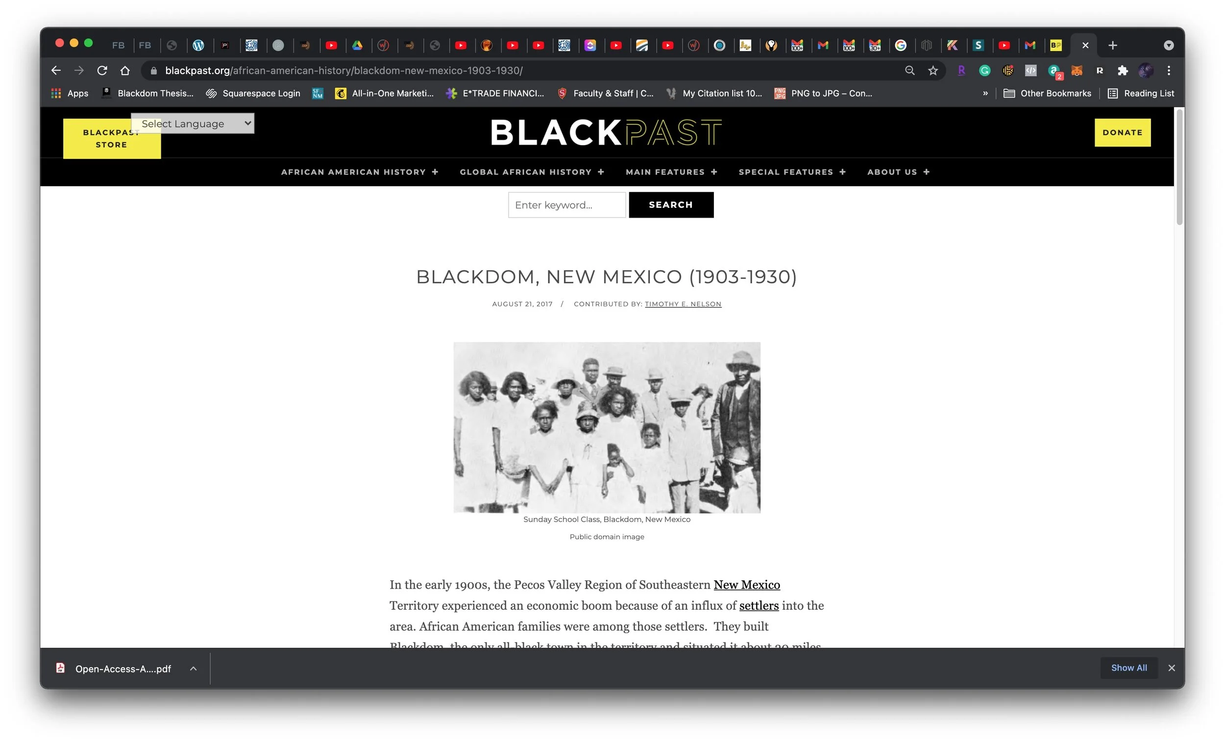 In the early 1900s, the Pecos Valley Region of Southeastern New Mexico Territory experienced an economic boom because of an influx of settlers into the area. African American families were among those settlers. They built Blackdom, the only all-black town in the territory and situated it about 20 miles south of Roswell in Chaves County. Today little remains of this ambitious frontier scheme that within a 20-year period became an oil-producing town.