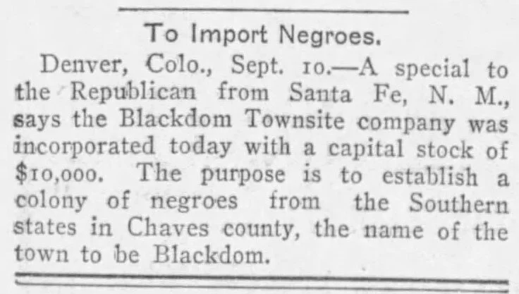 Santa Fe., N. M., Sept. 10.--The Blackdom Townsite company was incorporated with a capital stock of $10,000. The purpose is to establish a colony of negroes from the Southern states in Chavez county, the name of town to be Blackdom.